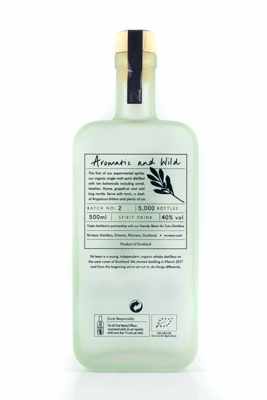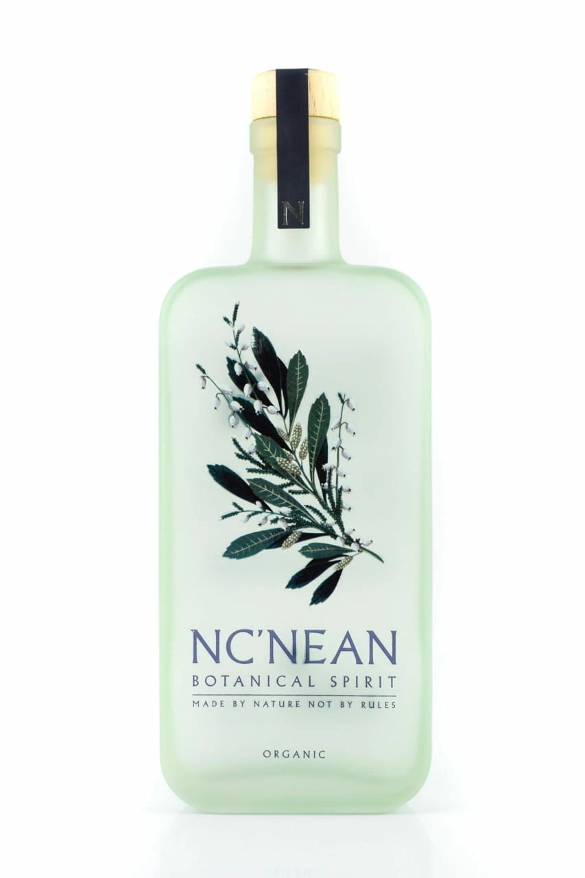 Für die innovative Spirituose im natürlichen Look destillierte Nc’nean in Zusammenarbeit mit der befreundeten, ebenfalls nachhaltig arbeitenden Brennerei Beinn An Tuirc ihren Whisky-Rohbrand ein zweites Mal – unter Zugabe von zehn Botanicals.